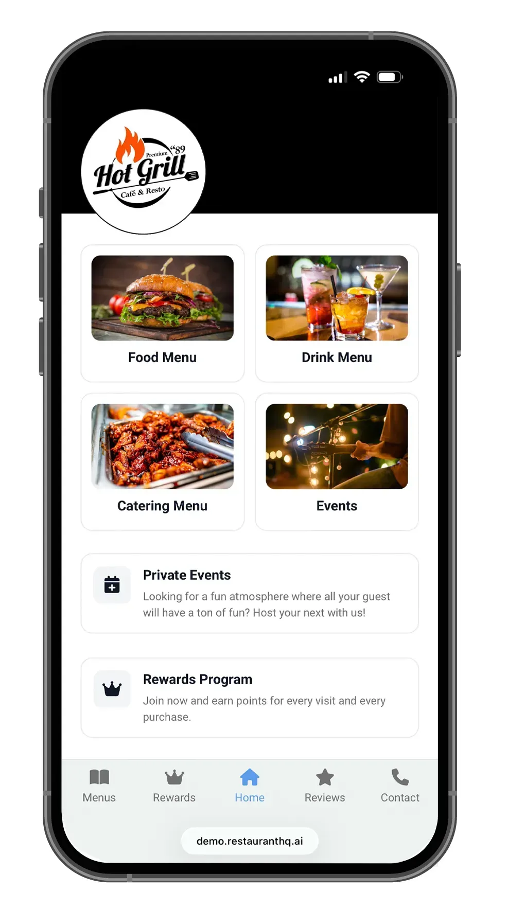 Give your restaurant a fresh new look with our mobile-first website. Designed to function like a mobile app, the menu icons are at the bottom of the page and it loads FAST! Users love the big tile buttons to visit additional pages within your website.